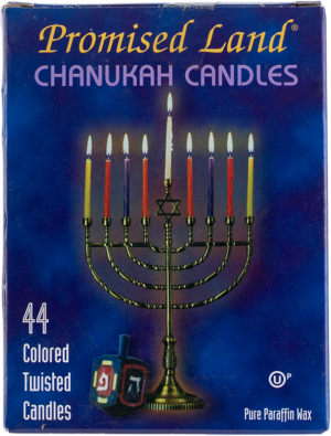 Promised Land brand makes Chanukah candles of twisted colored paraffin wax.
